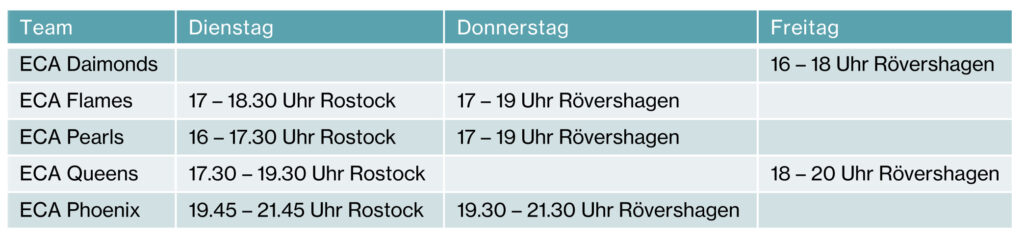 Die Trainings von EMPIRE CHEER ATHLETICS finden in zwei gut erreichbaren Sporthallen in Rövershagen und Rostock statt. Trainingstage sind Dienstag, Donnerstag und Freitag. An ausgewählten Wochenenden, insbesondere vor Wettkämpfen, finden zusätzlicheTrainingscamps statt. In den Ferien werden die Trainings teilweise ausgesetzt.