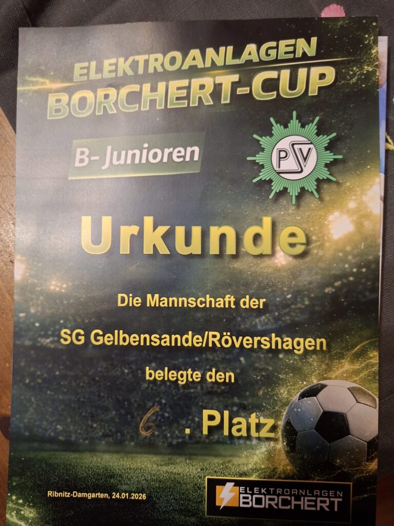 Die B-Jugend (Spielgemeinschaft mit Gelbensande) holte am Samstag beim Elektoanlagen Borchert-Cup in Ribnitz-Damgarten einen guten 6. Platz. Leider hat das eine oder andere Tor über die Tabelle entschieden. Die Spieler haben bis zum Ende gekämpft und einen tollen Zusammenhalt gezeigt. Sie müssen sich absolut nicht verstecken.